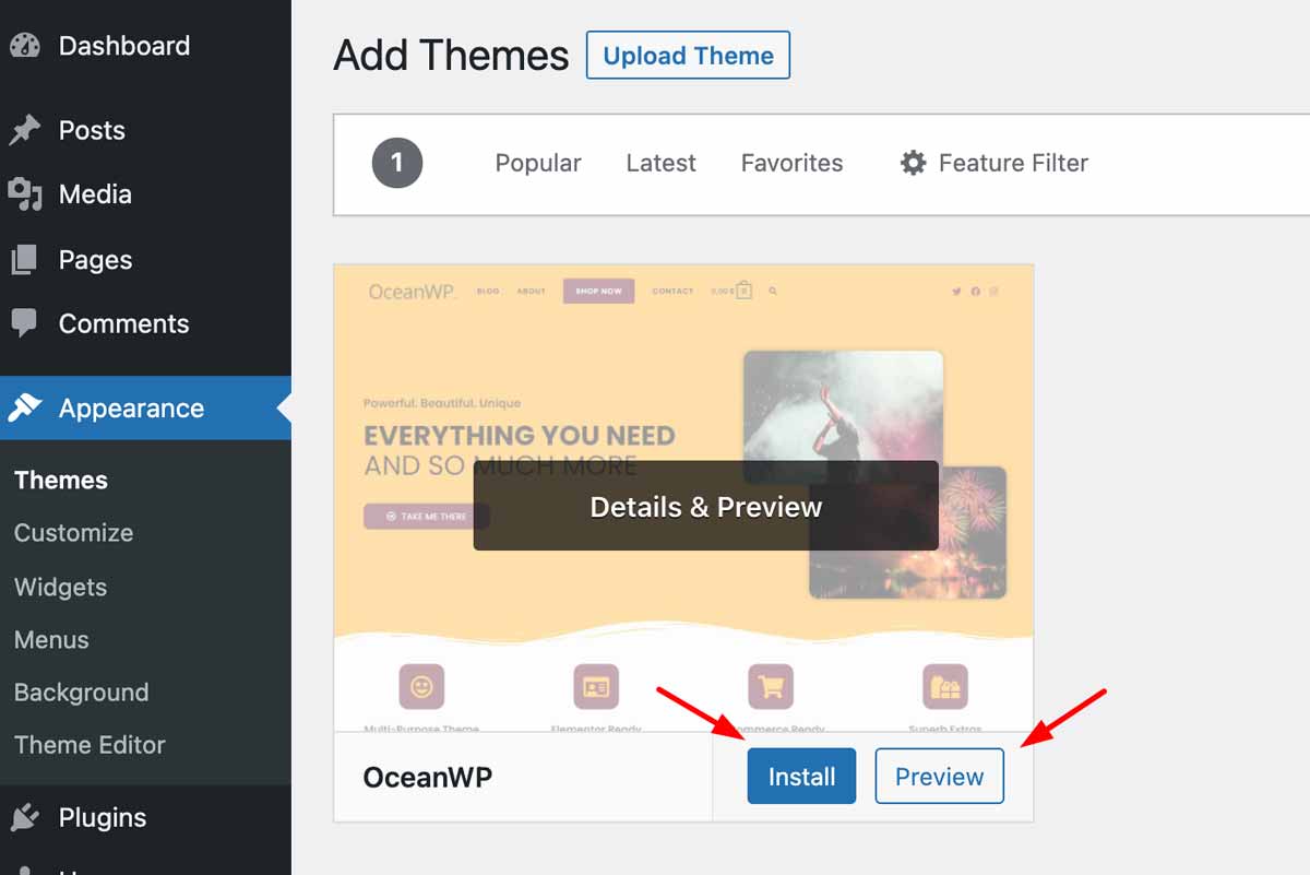 Ngay sau đó, bạn sẽ được chuyển sang một kho theme WordPress chính thức với hàng ngàn giao diện miễn phí. Bạn có thể: