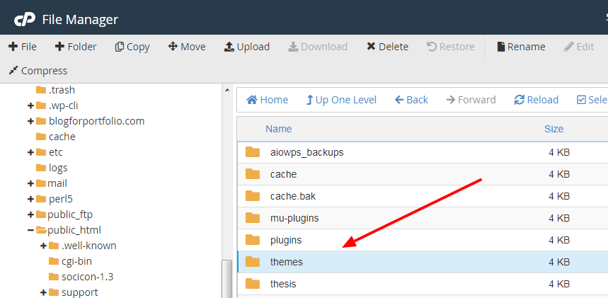 - Khi đang ở trong thư mục themes, hãy nhấn nút Upload ở thanh công cụ trên cùng.