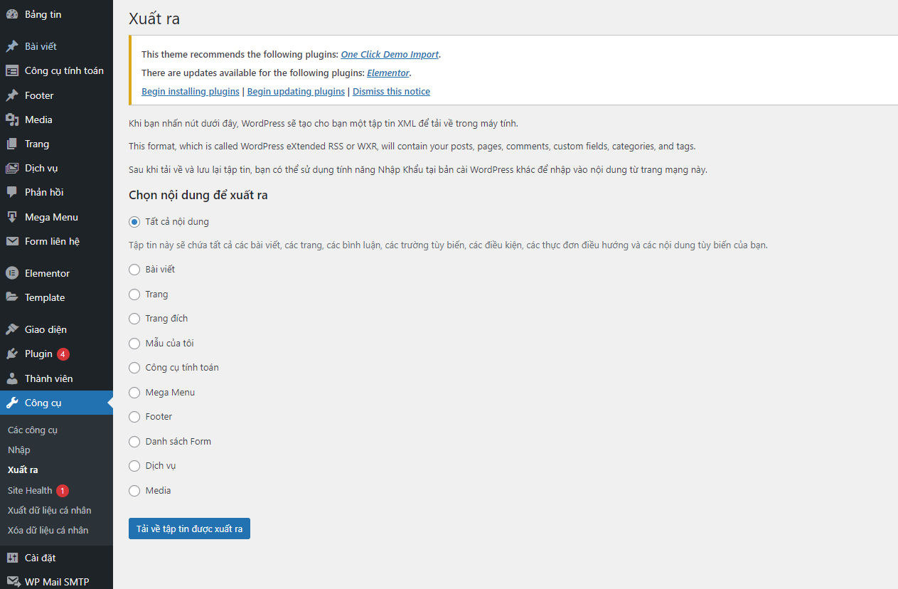 Xuất dữ liệu (Export) là hành động lấy dữ liệu từ WordPress ra bên ngoài dưới định dạng chuẩn như XML hoặc CSV. File này có thể dùng để: