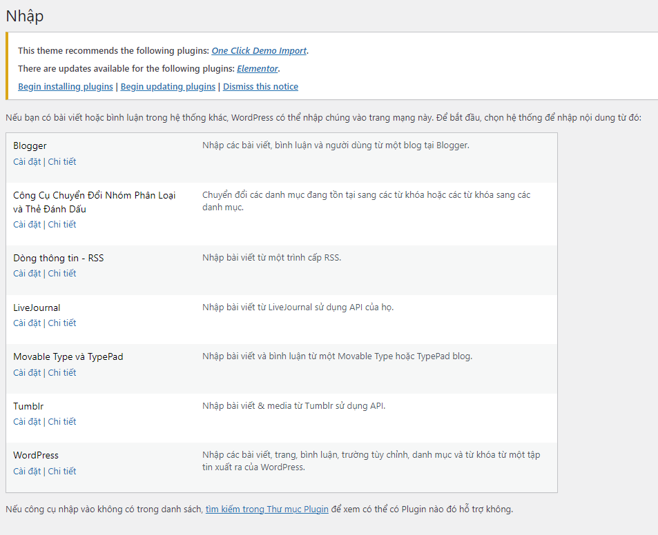 Nhập dữ liệu (Import) là quá trình đưa nội dung từ nguồn ngoài vào WordPress. Nguồn có thể là file XML, CSV, các trang blog khác hoặc thậm chí từ các hệ thống CMS như Joomla, Drupal, Blogger…