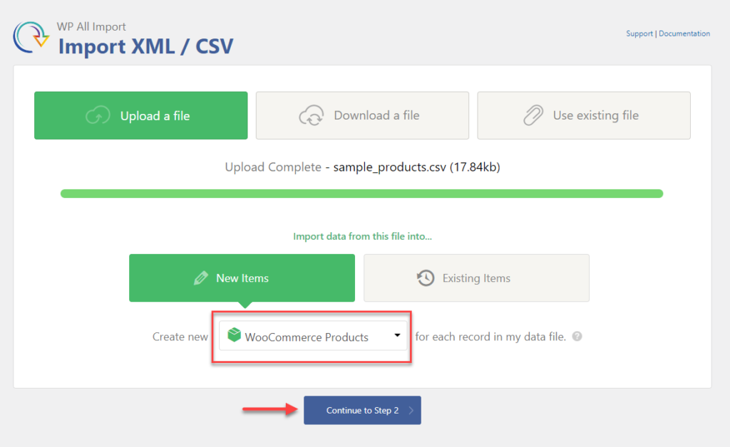 - Tải lên tệp CSV hoặc XML chứa dữ liệu sản phẩm và nhấn Continue to Step 2