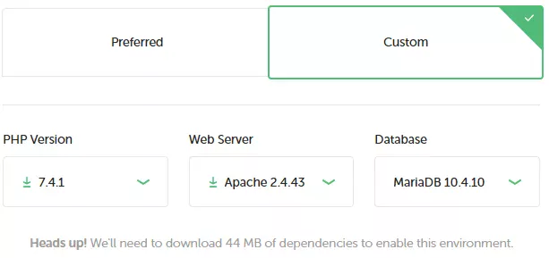 2. Chọn cấu hình: bạn có thể dùng cấu hình mặc định hoặc tự chọn phiên bản PHP, MySQL, và web server.