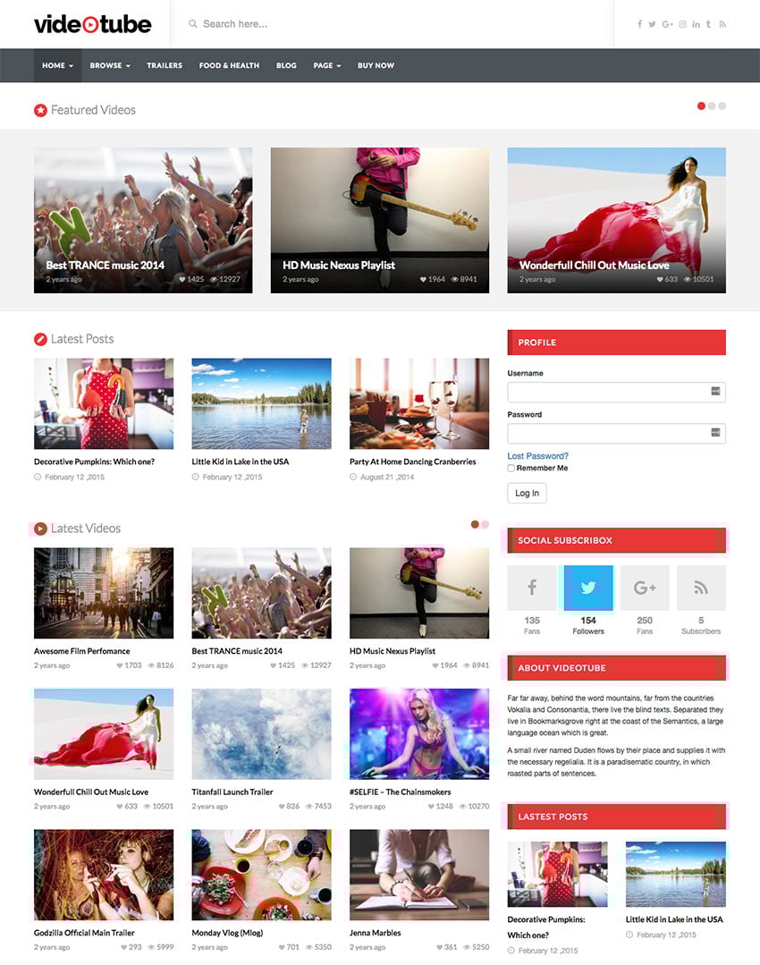 Theme cho các website chia sẻ video – tương thích tốt với YouTube, Vimeo… Hỗ trợ bình luận, đánh giá, danh mục video tiện lợi.